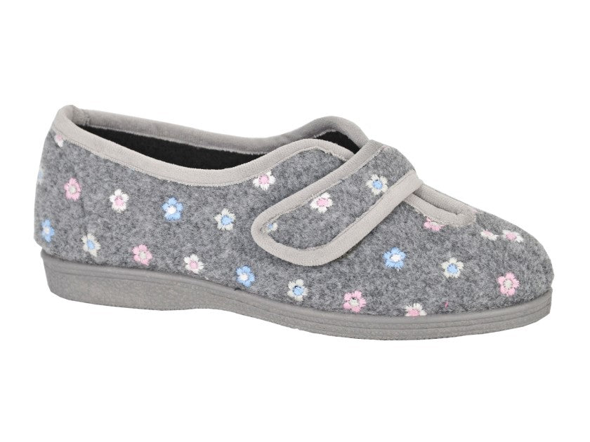 Navy or Grey Floral Embroidered TextileV Cut Touch Fastening SlipperTextile LiningVulcanised Rubber Sole